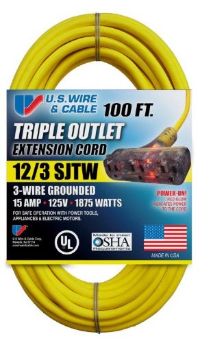 US Wire 76100 12/3 100-Foot SJTW Yellow Heavy Duty Extension Cord with Lighted Pow-R-Block