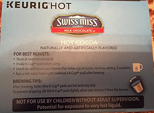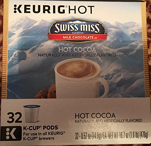 -. Binding : Misc. -. Brand : Swiss Miss -. EAN : 0611247354674 -. Feature : Keurig Hot / Swiss Miss Classics Milk Chocolate Hot Cocoa / (1) Box of 32 K-Cup Pods For use in all KEURIG K-CUP Brewers / Each Pod is .52 oz. -. IsAdultProduct : 0 -. Label : Swiss Miss -. Manufacturer : Swiss Miss -. PackageQuantity : 32 -. ProductGroup : Grocery -. ProductTypeName : GROCERY -. Publisher : Swiss Miss -. Studio : Swiss Miss -. Title : Swiss Miss Keurig Hot K-cup Pods Milk Chocolate Hot Cocoa - 32 Count -. UPC : 611247354674