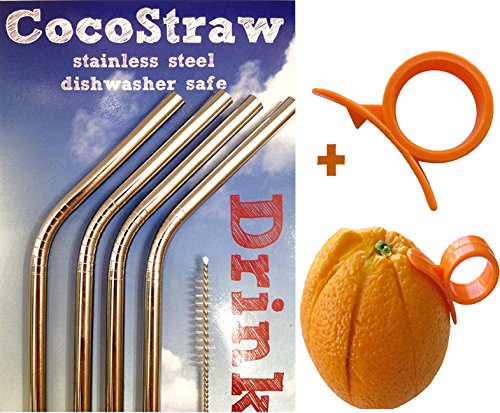 4 Stainless Steel Straws + FREE Cleaning Brush & Citrus Peeler -- FUN! Handy, Elegant, Metal, Washable, SAFE, NON-TOXIC non-plastic or glass - UNbreakable! CocoStraw Brand Drinking Drink Straw