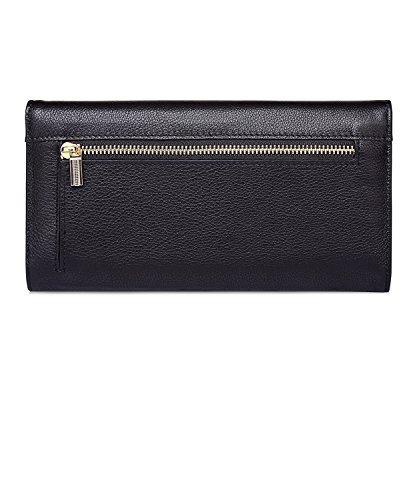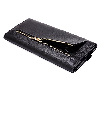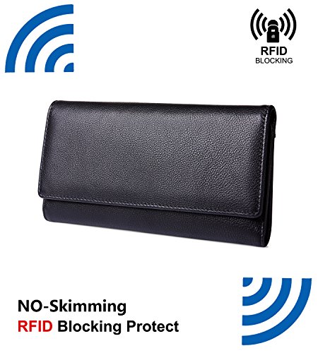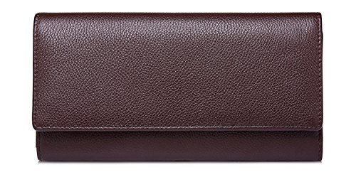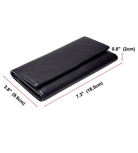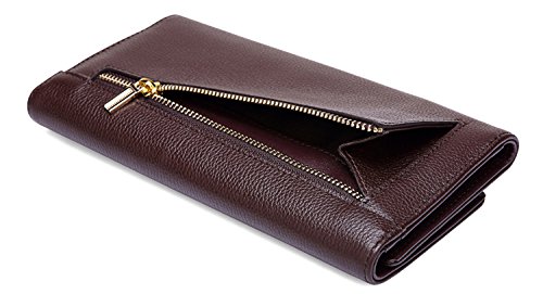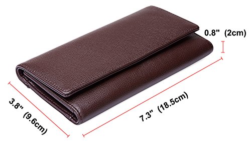 -. Feature : RFID BLOCKING KEEPS SECURITY AND SAFETY - Tested for 13.56 MHz Frequency in which credit cards and debit cards operate, RFID blocking wallet can prevent your card account number and related valued data from being reading, protect your P.R.Ivate information security / TRI-FOLD DESIGN AND VINTAGE LOOK - Clear Structure and Tri-fold design keep things organized well. Soft genuine leather, matches heavy duty metal zipper, makes wallet vintage and timeless. Hidden snap closure easy to open and close, keep all your cards, bills, coins safe / FUNCTIONAL WITH LARGE STORAGE - 13 credit card slots, including 1 ID window with thumb slide for quick access. 3 interior compartments for bills, but that's not all - we also include 1 exterior zipper coin pocket on the back of wallet. It's a great way for woman to keep all her essentials in order / FULL GRAIN LEATHER - Made from full grain cowhide leather, the leather boasts pebbled textures and a soft hand feel, exquisite sewing craft brings to neat and durable stitching, excellent quality keeps appearance new even after using a long time / IDEAL DIMENSION FITS SMART PHONE - L7.3" * W3.8" * 0.8", this pocket wallet fits smart cell phone with Maximum size 5.5" * 2.7" *0.29", such as iphone 6s, iphone 5s etc, comfortable to clutch on hand for women