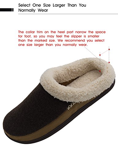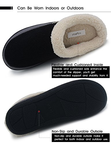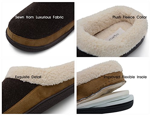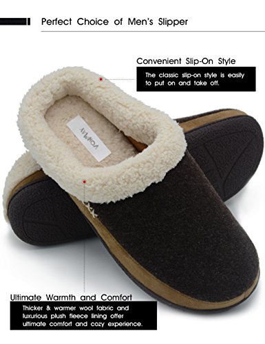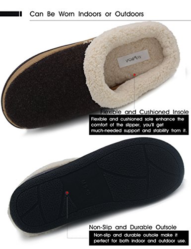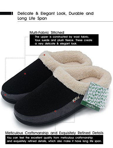 You'll never want to take it off because: * The insole in this slipper is constructed from 3 layers of memory foam and sponge. The top layer is high-density memory foam which offers a steady, elastic and comfortable foot feeling. The bottom 2 layers are sponge. This design will help provide cushioned and supported steps so that you can walk comfortably from room to room. * It can be worn indoors while lounging around and outdoors when collecting the mail or picking up the newspaper with the non-slip side-seamed waterproof outsole. * The attractive stitched wool and faux suede upper fabric will keep your feet warm and comfortable all year long. You will feel like you are walking on a cloud with these lightweight slippers. * The deep toe box design allows the foot to relax and spread out naturally for added comfort. But also make sure to take good care of them: * Keep them clean. They are hand and machine washable. * Due to the special suede material, we highly suggest your air-drying the slippers after washing. * Do not throw them at anyone when you are angry. * Tell your dog that it is not a play toy. Forget the flimsy slippers you've seen at other stores, these slippers by Vonmay will offer you maximum comfort and support. 0 |