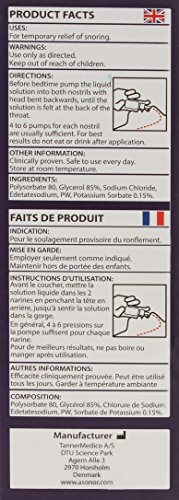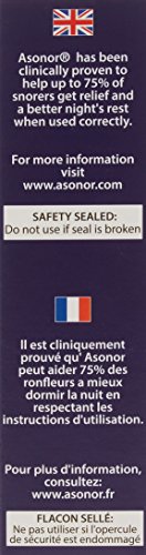 -. Binding : Health and Beauty -. Brand : Asonor -. EAN : 0698798611050 -. Feature : #1 Stop Snoring Product in Europe / Snoring is eliminated or considerably reduced in nearly 3 out of 4 persons / Asonor® is registered by the health authorities in approx 50 countries / One bottle is about one month supply / Asonor lubricates and softens the mucous membranes in the throat -. IsAdultProduct : 0 -. Label : Tanner Medico A/S -. Manufacturer : Tanner Medico A/S -. Model : ASONOR -. MPN : ASONOR -. PackageQuantity : 1 -. PartNumber : ASONOR -. ProductGroup : Health and Beauty -. ProductTypeName : HEALTH_PERSONAL_CARE -. Publisher : Tanner Medico A/S -. Studio : Tanner Medico A/S -. Title : Stop Snoring antisnore anti snore drop solution spray : ASONOR -. UPC : 698798611050