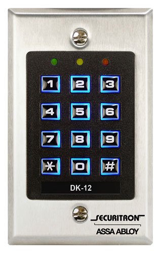 -. Binding : Misc. -. Brand : Securitron -. Color : stainless-steel -. EAN : 0093521200189 -. Feature : Stainless steel backplate with 12 illuminated keys (10 digits + "*" and "#" keys) / One piece digital keypad specifically designed for control of electric locks / Easy to install with simple hand tools / Operates on low voltage AC or DC current / Audible keystroke echo -. Label : Securitron -. Manufacturer : Securitron -. Model : DK12 -. MPN : DK12 -. NumberOfItems : 1 -. PackageQuantity : 1 -. PartNumber : DK12 -. ProductGroup : BISS -. ProductTypeName : MECHANICAL_COMPONENTS -. Publisher : Securitron -. Studio : Securitron -. Title : Securitron Single Gang Digital Keypad System with Illuminated Keys, 99 User Code Capability -. UPC : 784607040385