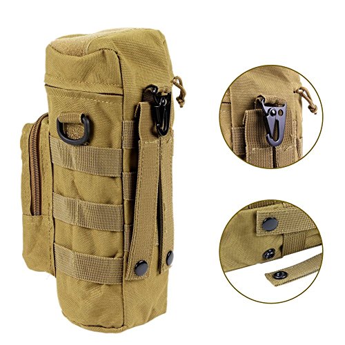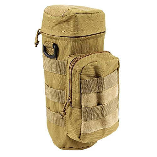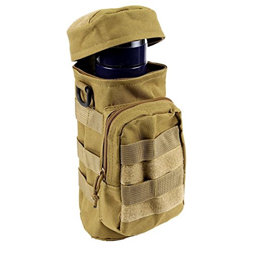 -. Brand : Sportsun -. Feature : Compact & lightweight - sturdy to carry good amount weight. Dimensions 10.5*4*4 inches / Made of 600D polyester durable, wear resistant and stylish. It can hold a bottle up to 10.5'' (H) x 4"(D). / The main compartment of the pouch is well padded and associated with a drain hole. We have made a straw hole on the top section of the pouch. There is a zipper closure flip top. / Easy to wash and the color will not bleed easily. There is a zippered utility pocket provided for easy and convenient storage. / The pouch bag is quiet spacious and it is quiet sturdy to carry heavy weight and large water bottles. Perfect for travelling purpose, or for the outdoors and it will keep you hydrated and fresh. -. IsAutographed : 0 -. IsMemorabilia : 0 -. Label : Sportsun -. Manufacturer : Sportsun -. PackageQuantity : 1 -. ProductGroup : Sports -. ProductTypeName : OUTDOOR_RECREATION_PRODUCT -. Publisher : Sportsun -. Studio : Sportsun -. Title : Ultra-light Molle Compatible Water Bottle Pouch Brand New High Quality Polyester Body Durable Zipper Closure Flip Top Coyote for Outdoor Activity Using Khaki