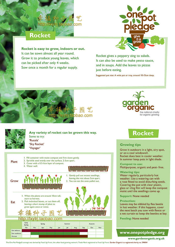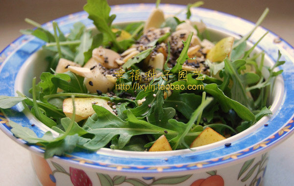 Arugula;; also called the rocket lettuce, this plant has a very strong smell of sesame, named arugula. Native to East Asia and the Mediterranean, developed taproot, root depth, plant height 30 ~ 40 cm, yellow flowers. Hi warm and cold humid climate, salt tolerance and drought, strong resistance to cold. The seedling leaves or the edible part, has the very strong smell of sesame, smooth taste, can be fried, soup or salad.