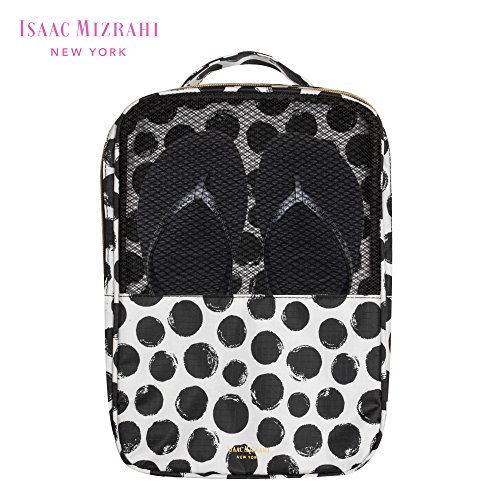 Protect your favorite, must-have footwear while keeping it away from your clothes and other essentials with this travel shoe bag by Isaac Mizrahi! This organizer bag with a top carry handle makes an accessible and convenient way of bringing your shoes for hitting the gym, traveling for work or vacation, or just changing on the go. This travel shoe bag features a mesh panel that provides proper airflow and ventilation, so your favorite shoes will remain fresh even when stored. No worries on your shoes getting scattered around as the zipper closure keeps everything intact and in place. A variety of designs set off a bright hardware that sets these bags apart from plain ones. Not only are these easy to spot when traveling, but they're also stylish enough to show-off your cool personality. 0