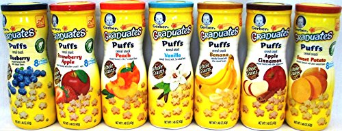 This hard to find convenient Gerber Graduates Puffs Variety Bundle includes: 1 Snack Catcher of Good Quality (color will vary); 3 Disposable Crumb Catcher Bibs and 5 super soft Sanitizing Hand Wipes exclusively from Narrow Path Sales. These are all 7 of the Puffs currently being offered by Gerber. The flavors include: Blueberry; Strawberry Apple; Peach; Vanilla; Banana; Apple Cinnamon; Sweet Potato. The experts at GERBER have designed the GRADUATES line of meal options for the developmental and nutritional needs at each stage. This variety pack is designed for crawling babies learning to pick-up, crawls with stomach off the floor, begins to self-feed with fingers, and begins to use jaw to mash food.Feature