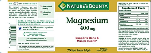Nature's Bounty High Potency Magnesium provides 100% of the daily recommended value for this important mineral in just one softgel. Magnesium is essential for supporting bone health, and plays an important role in maintaining bone mineralization. As a component in over 200 enzymes in the body, Magnesium is also involved in muscle contractions, nerve impulses, energy metabolism and protein formation.