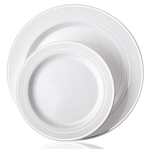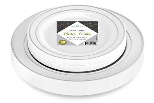 Elite Selection Set Of 40 Party Plastic Plates Silver Rim Includes 20 Dinner Plates 10.25" And 20 Salad / Dessert Plates 7.5"