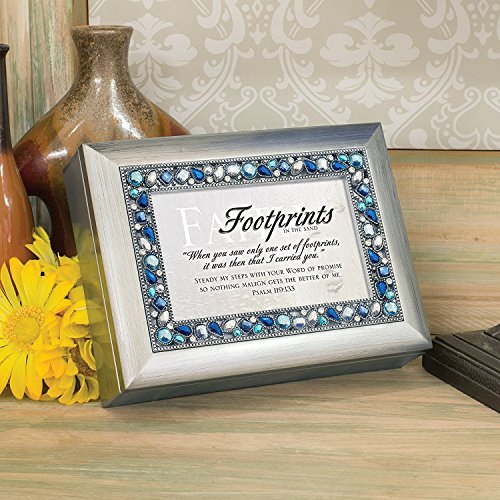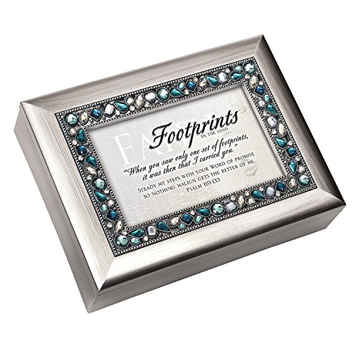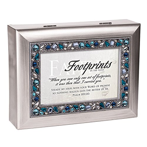 Footprints Brushed Silver Finish Jeweled Lid Jewelry Music Box Plays Tune How Great Thou Art