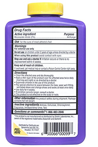 Studio : GENOMMA LAB USA, INC. Publisher : GENOMMA LAB USA, INC. Binding : Health and Beauty Product Description Silka powder miconazole nitrate (2%) in a soothing cellulose and talc powder base. Cures most athlete's foot infections between the toes. Relieves itching, burning and scaling. Absorbs excess moisture to help keep toes dry. Silka medicated foot powder keeps feet dry by absorbing excess moisture. Relieves itching, scaling, cracking, burning, redness, soreness, irritation, discomfort, chafing associated with athlete’s foot, jock itch and ringworm. To use: Clean the affected area and dry thoroughly. Apply a thin layer of the product over the affected area twice daily (morning and night).Silka powder miconazole nitrate (2%) en una base de polvo de celulosa y Talco calm ante. Se cure las infections del pie de athlete mass entre loss dados de loss pies. Alivia la picaroon, ardor y descamacion. Absorbed el excess de Hume dad para aurar a mantener loss pies secos. 0