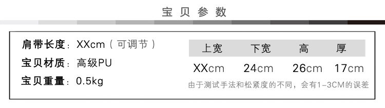 color 3Style: shoulder bagBackpack way: Shoulder MessengerTexture: PUStrap styles: singleLining Material: Polyester