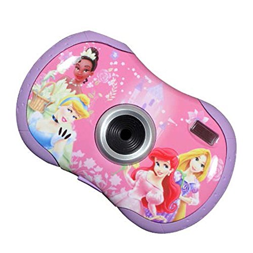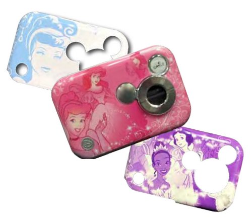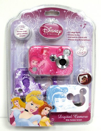 Your little lady can capture her magical world with this Disney Princess Digital Camera. The perfect first camera for budding photographers, it takes 2.1MP images and features an easy-to-use interface with a screen for previewing. It includes three interchangeable faceplates that are each decorated with a different Disney Princess graphic, so she can switch it up any time she wants to show off a different royal look! The Disney Princess 2.1MP Digital Camera Pink features: Includes a digital camera with wrist strap, USB cable, software CD, user manual, Quick Start guide and 3 interchangeable face plates. Simple interface makes this a great first camera for budding photographers Included Disney Princess themed software makes it easy and fun to edit, organize, and share photos Three interchangeable faceplates decorated with pretty Disney Princess graphics Outputs: USB Requires 3 AAA batteries (not included) Dimensions: 4 x 2.5 inches 1-year warrantyFeature