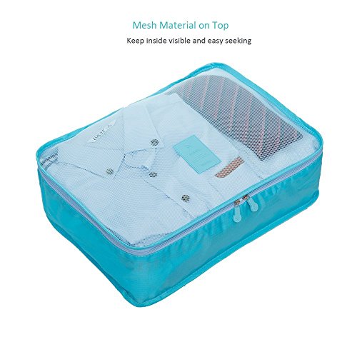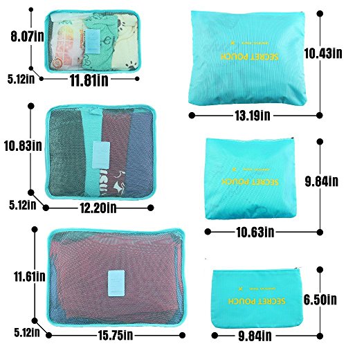 GREAT VALUE SET: 6 TRAVEL PACKING CUBES that include: 3 MESH LUGGAGE CUBES: Large(15.7'' x 12.2'' x 4.7'') & Medium(12.2'' x 11'' x 4.7'') & Small(11.8'' x 8.27'' x 4.7''); 3 COMPRESSION BAGS: Large(13.4'' x 10.6'') & Medium(10.6'' x 10.2'') & Small(10.6'' x 6.7'').Ideal for active lifestyles including traveling, backpacking, camping, gym, beach, or yoga. Protect clothes and luggage from wrinkles, dirty and damage during the traveling.