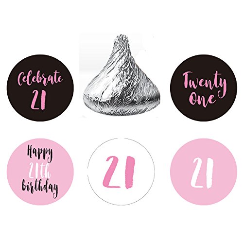 Pink 21th Birthday Party Favor Stickers, Round Candy Labels Fit Hershey’s Kisses, 200 Count