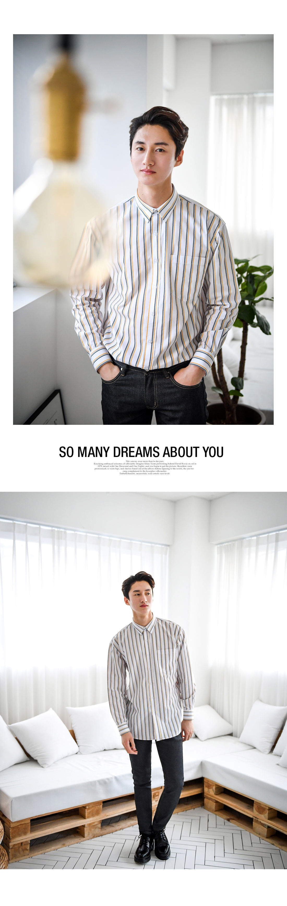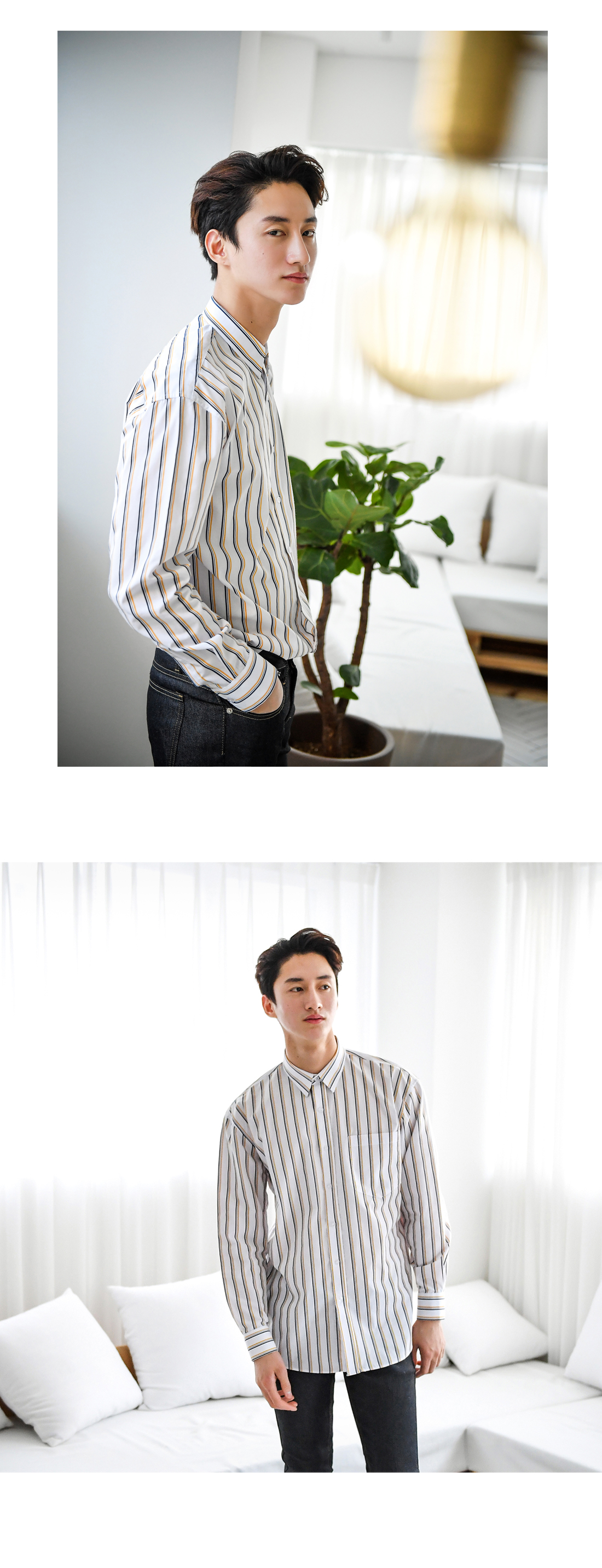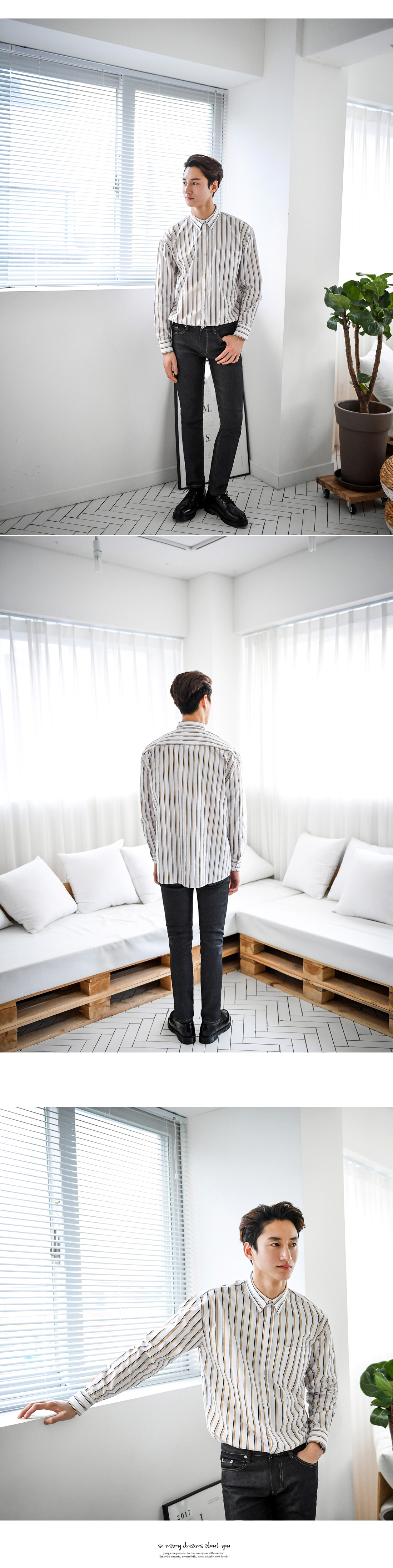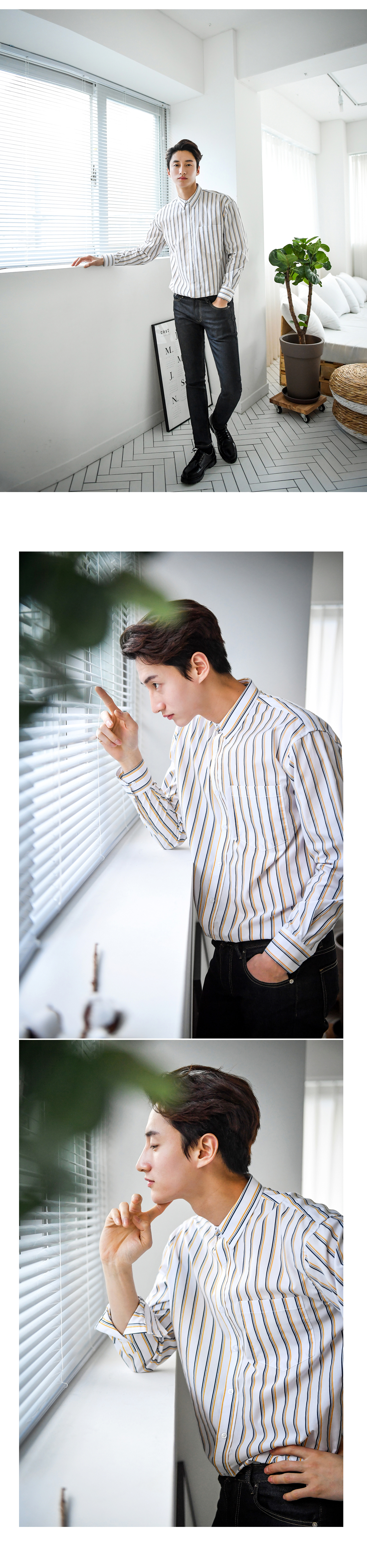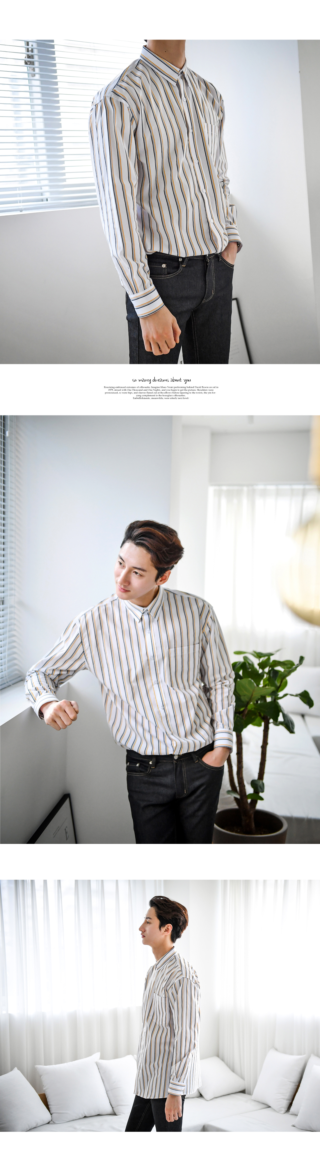 -매력적인 핀스트라이프 셔츠입니다-3중의로 배색된 핀스트라이프가 매력적인 상품으로-단품으로도 트렌디한 코디가 가능하며-베이직하지만 은은한 컬러 포인트가 있는 디자인으로-부담없이 코디하기 너무 좋은 제품입니다-캐주얼부터 댄디한 스타일까지 소화 가능하며-레이어드 하기 좋아 데일리 필수템으로 가지고 있기 좋습니다