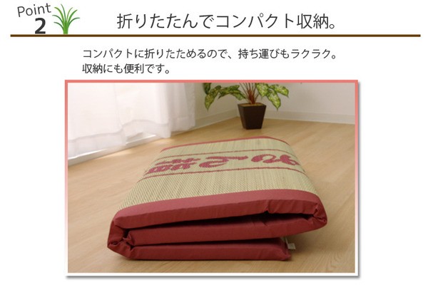 寝っころがってテレビを見たり、折りたたんで腰かけたり、リビングでのお昼寝用に、などいろいろな使い方ができるフリーマットです。お仕事のちょっとした休憩時間の仮眠もに最適です。い草には1.綿の約2.5倍の吸湿性があり汗のじめじめを軽減します。2.湿度の調整作用があり、蒸れにくく快適な就寝を促します。3.汗のにおいの元となる化学物質を90%以上抑え、においを軽減します。などの効果があります。中材には固わた40mmを使用していますのでフローリングでも快適にご使用頂けます。い草に青森ヒバ加工を施しています。(抗菌・防臭効果)青森県のヒバの木から抽出した「ヒバ油」を現地に送り、メーカー独自の技術で材料や商品に加工しました。「ヒバ油」には、ヒノキチオールという天然物質としては極めて抗菌性の高い成分が含まれ、医療や食品など多分野で利用研究が進められています。※自然素材であること、また職人が一つ一つ手作業にて加工を行うため、形状のバラつきや表示サイズと多少異なることがあります。ご了承下さい。