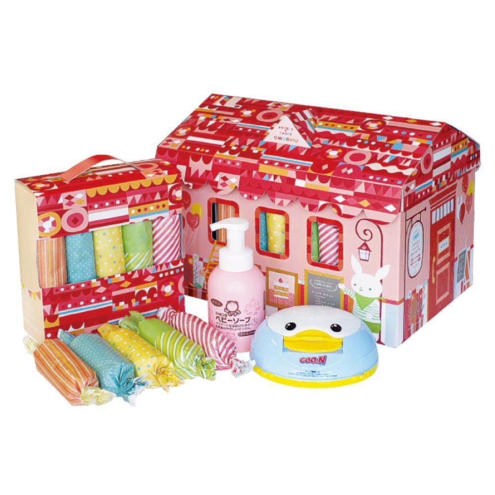 | おむつやおしりふきシート、ベビーソープがかわいいBOXに入っています。おうちをモチーフにした女の子向けデザイン♪ |