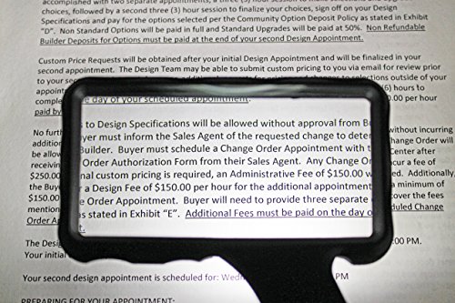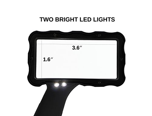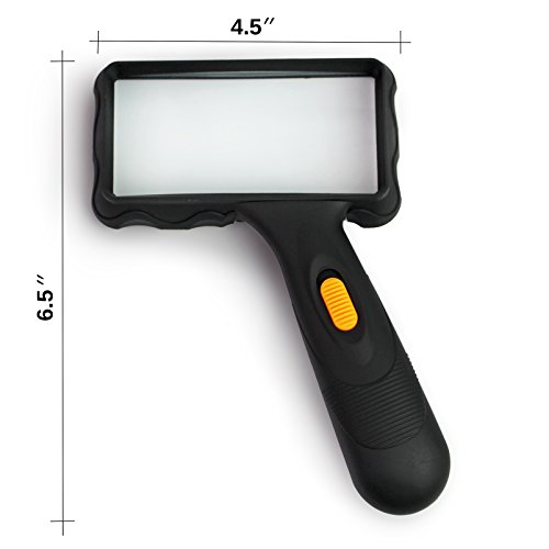 • OVERSIZED MAGNIFLYING VIEW: Our jumbo rectangular magnifying glass comes with a generous The magnifying glass is 4.25 x 6.5" and the actual glass is 3.6" x 1.6”, providing you with a large visual field without distortions. The rectangular lens design is superior to round reading glass magnifiers, and provides most natural shape of the items you are reading or inspecting.