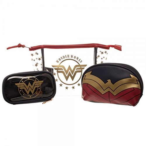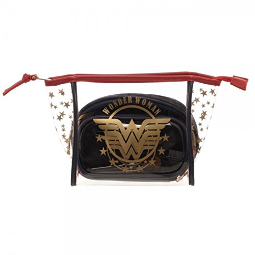 Binding : Apparel Product Description Travel the world from Themyscira in style with this Wonder Woman Jrs. Cosmetic 3 Piece Set. It includes a large, clear PU pouch with gold stars and Wonder Woman logo, medium navy domed pouch with red and gold Wonder Woman logo and uniform detailing, and a small 4-piece gold-tone cosmetic brush set with navy and white star-print travel case. By the goddess, this is stylish! 0