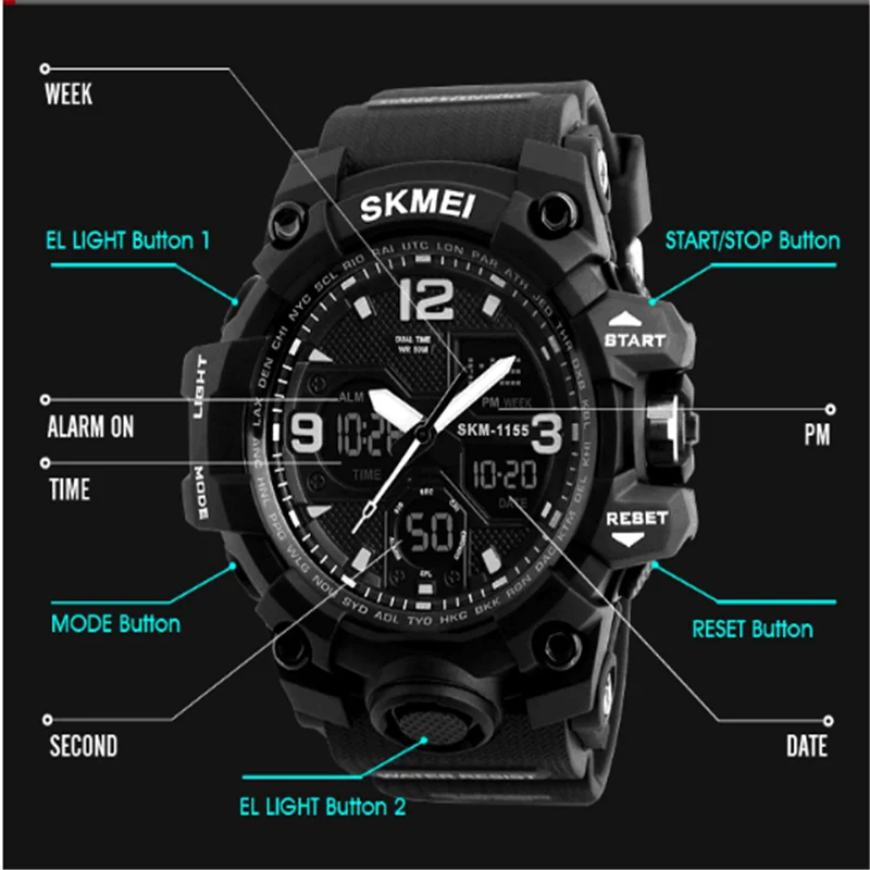 Feature:Back Light,Alarm,Water Resistant,Multiple Time Zone,Chronograph,Week Display,Shock Resistant,Stop Watch,Complete Calendar,Swim,Auto Date,LED display