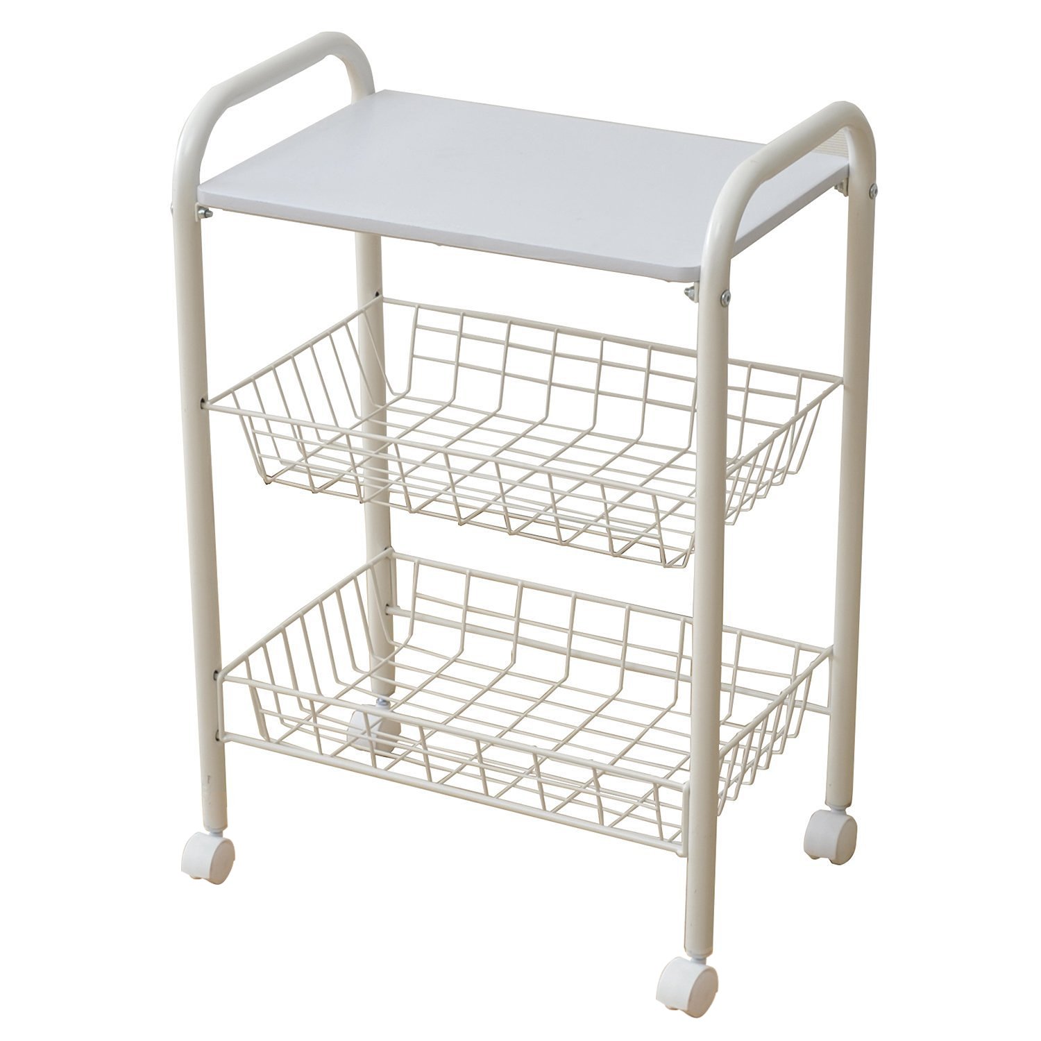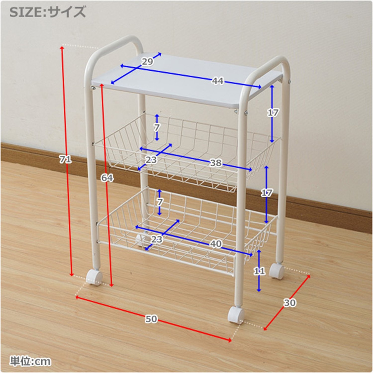 ● Assembled ● Kitchen wagon in basket storage ● Compact size happy in limited space ● Top plate size: Width 44 Length 29 cm ● Upper basket inside dimension: Width 38 Length 23 Depth 7 cm ● Lower basket inside dimension: Width 40 Length