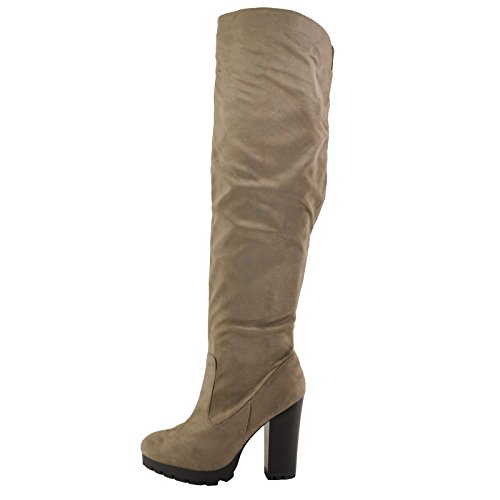 Binding : Apparel Product Description Reach new heights in the fierce and fall ready Gaby 12 - these thigh high platform boots by Bamboo! Man-made materials cup your heel as a lightly padded insole cushions your every step, convenient side zipper closure and non-skid lug sole, all providing a durable, securable and comfortable extended wear! Finished in man-made faux suede upper, almond toe construction with faux fur lining, elastic panel on side, lug sole and a chunky stacked heel, these platform boots will boost any ensemble this season! 0