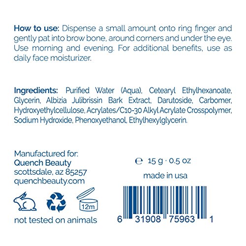 -. Binding : Misc. -. Brand : Quench Beauty -. EAN : 0631908759631 -. Feature : LIFTS SAGGING EYELIDS. Uses plant extracts from the Persian Silk Tree and Asteraceae Siegesbeckia Orientalis to target the sagging upper eyelids. / REDUCES CROWS FEET. Fights against the formation of crow's feet and wrinkles, reducing the aged appearance. / FADE DARK CIRCLES. Evens out skin color to reduce the appearance of dark circles. / DIMINISH PUFFINESS. The Persian Silk Tree Extract's anti-glycation effect helps tighten and protect the delicate skin around the eye from the degrading effects of glycation, lifting the lids and restoring a more youthful appearance. -. IsAdultProduct : 0 -. Label : Quench Beauty -. Manufacturer : Quench Beauty -. Model : QBEL04 -. MPN : QBEL04 -. PackageQuantity : 1 -. PartNumber : QBEL04 -. ProductGroup : Beauty -. ProductTypeName : BEAUTY -. Publisher : Quench Beauty -. Studio : Quench Beauty -. Title : Quench Beauty Anti-Wrinkle Lift Eye Cream, 0.5 oz -. UPC : 631908759631