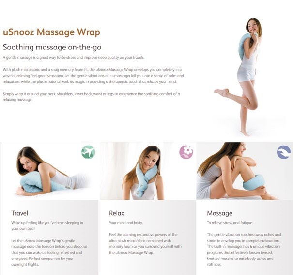 With plush microfabric and a snug memory foam fit, the uSnooz Massage Wrap envelops you completely in a wave of calming feel-good sensation. Let the gentle vibrations of its massager lull you into a sense of calm and relaxation, while the plush material work its magic in providing a therapeutic touch that relaxes your mind. Travel Wake up feeling like you’ve been sleeping in your own bed! Let the uSnooz Massage Wrap’s gentle massage ease the tension before you sleep, so that you can wake up feeling refreshed and energised. Perfect companion for your overnight flights. Relax Your mind and body. Feel the calming restorative powers of the ultra plush microfabric combined with memory foam as you surround yourself with the uSnooz Massage Wrap. Massage To relieve stress and fatigue. The gentle vibration soothes away aches and strain to envelop you in complete relaxation. The built-in massager has 6 unique vibration programs that effectively loosen tensed, knotted muscles to ease body aches and stiffness.