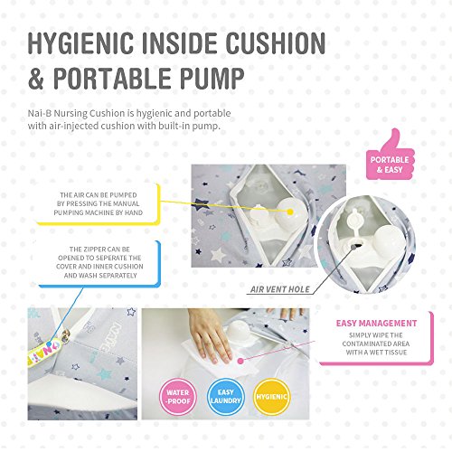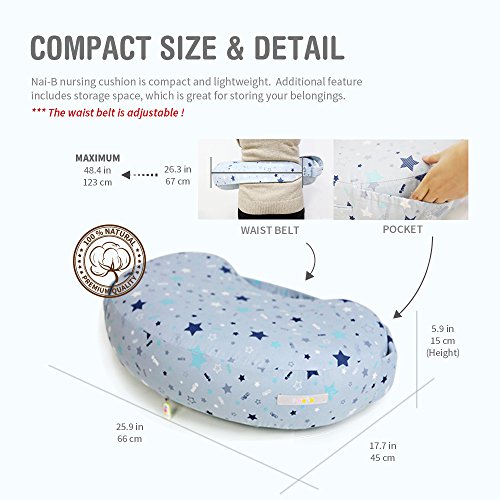 -. Feature : 100% cotton cover / Germ-resistant TPU inner chamber / Adjustable air chamber with a built in pump / Wide and sturdy waist belt / Light and easily portable travel nursing pillow