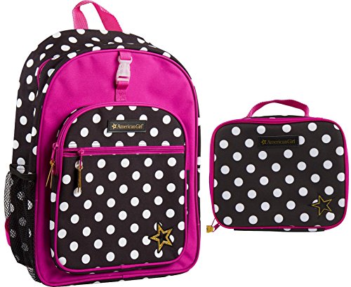 -. Feature : Deluxe American Girl 2 Piece backpack set in pretty polka dots with pink trim. / Large main compartment with additional front zip pouch and mesh water bottle pocket. American Girl themed star shaped zipper pulls. / Fully lined backpack has a convenient inner pouch. Padded back and adjustable padded straps ensure a comfortable fit. Convenient clip on the front to attach lunch box; handy carry / locker loop / Matching lunch tote with woven graphics, gold star accents and gold American Girl logo. Easy care, wipe clean interior.