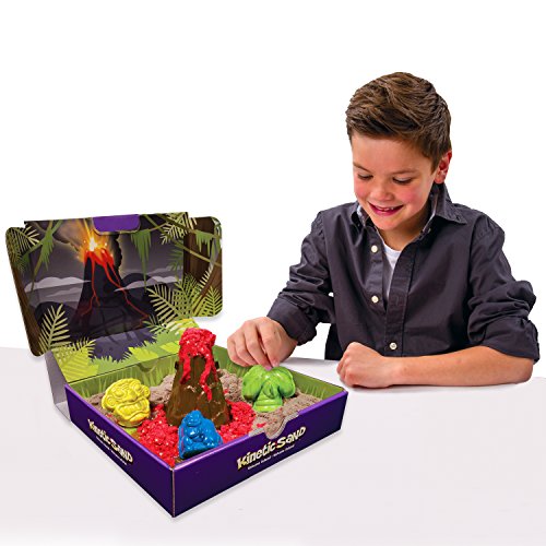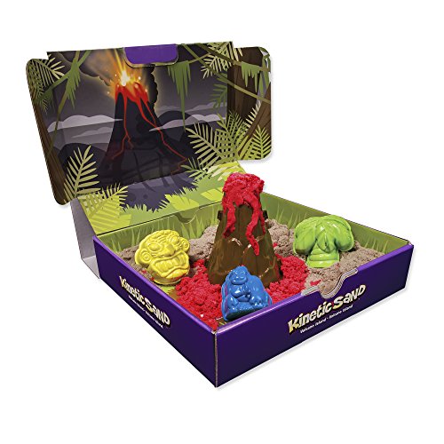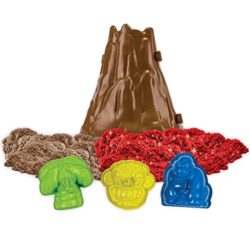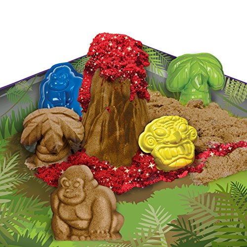 Kinetic Sand holds its shape to pick up and play! Kinetic Sand Volcano Island lets you create a colorful volcano right in your own home! Use 2 fiery colors of sand and watch it ooze down the side of the Volcano! With the 4 jungle molds create apes, artifacts and palm trees to surround your Volcano. The sandbox play space opens up into a fiery Island landscape to play in. When it’s time to put it away, this soft and stretchy sand easily cleans up and stores inside the play space! It never dries out and is gluten free. Feel the difference with the Kinetic Sand Construction Tools.Feature