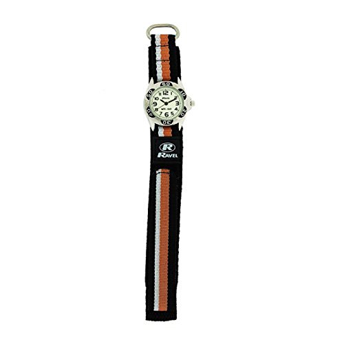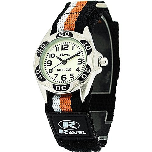 -. Title : Ravel Nite-Glo Quartz Luminous Dial Black Orange White Velcro Boys Watch R1704.8