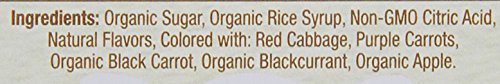 原材料:有機砂糖、有機米シロップ/クエン酸、香料、着色料(アカキャベツ、ムラサキニンジンジュース、クロニンジンジュース、ブラックカーラント果汁、リンゴジュース)