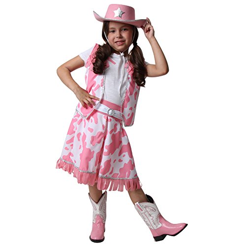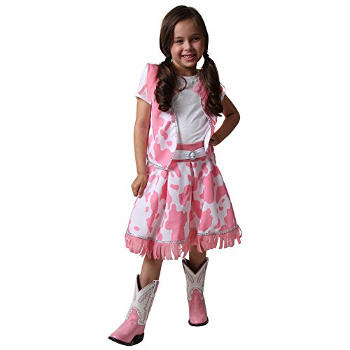 -. Brand : Storybook Wishes -. Color : Pastel Pink -. Department : girls -. Feature : Includes skirt and vest / Fun for a Halloween costume, theme party favor, and everyday dress up / Perfect for play time, stage time or school dress up days / Pastel pink cow P.R.Int spots / Little cowgirls can giddy-up for dress-up fun with this colorful set -. ProductGroup : Apparel -. ProductTypeName : CHILDRENS_COSTUME -. Title : Classic Pastel Pink Cowgirl Costume Vest & Skirt (Choose Size)