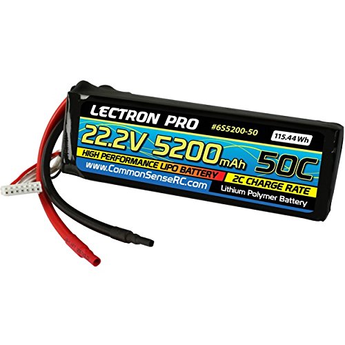 Studio : COMMON SENSE RC Publisher : COMMON SENSE RC Binding : Electronics Product Description This 22.2V (6S) 5200mAh 50C lithium polymer battery pack is a high-performance option for a variety of different applications: large multirotors, EDF Jets, 600 to 700-size helicopters and more. These lipo packs are made with Lectron ultra-compact 5200mAh cells that give you a weight savings of up to 20% versus 5000-5200mAh lipos from many other manufacturers. That massive weight savings means lighter total loads for longer flight times and more agile, powerful performance from your aircraft. Wire multiples of these batteries in parallel for super-lightweight 6S 10,400mAh, 15,600mAh or 20,800mAh setups for large-scale multirotors. 0