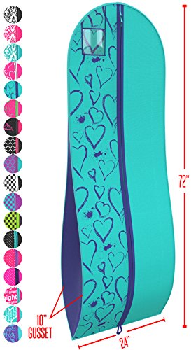 Product Description Keep your cherished gowns and dresses protected in this premium quality garment bag from Your Bags. This garment bag makes preparing for formal affairs less stressful. Pick from a variety of unique styles and prepare to turn heads! You'll feel at ease knowing that your beautiful dress is shielded from damage and destruction. FEATURES: ? Non-Woven 80 GSM ? 72 x 24" ? 10" Tapered Gusset ? Dual Zipper Slider ? Bottom Hanging Loop ? Hanging ID Pocket COLORS STYLES: ? Black White Checkered ? Black Lime Green Checkered ? Blue Purple Checkered ? Green Pink Heart ? Fuchsia White Heart ? Tiffany Navy Heart ? Fuchsia Purple Polka Dot ? Black Tiffany Blue Polka Dot ? Fuchsia Navy Polka Dot ? Pink Purple Polka Dot While most garment bags are made from a 60 GSM ours are constructed from a super durable non-woven 80 GSM that makes our bags stronger and more protective. Measuring at 72 x 24 inches with a 10 inch tapered gusset it provides enough space for ball gowns and dresses with full skirts without causing any damage. A bottom loop that fastens to your hanger to join both ends makes it easy to carry and store without dragging on the ground. While dual slide zippers allow you to quickly access its contents from both ends. A large visible hanging ID pocket makes it easy to identify your bag and whatever you keep stored inside of it. MULTI-PURPOSE This bag doesn't just hold dresses either it also easily functions as a garment bag for men's suits and clothing. A roomy interior means you can fit virtually any type of clothing in this bag you can smartly transport and store multiple small clothing items. Store apparel in this bag and keep it protected from moth damage and dust for many years! 0