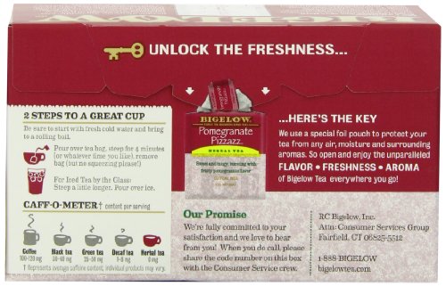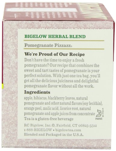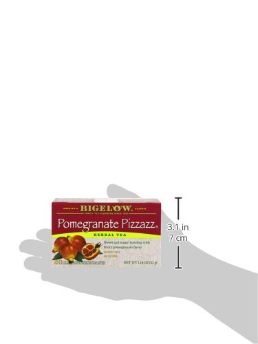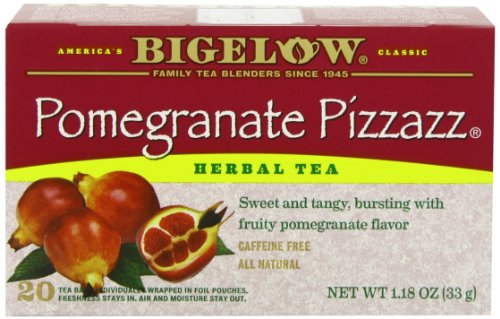 -. Binding : Grocery -. Brand : Bigelow Tea -. EAN : 0072310010130 -. Feature : Pack of six 20-count boxes of calorie-free herbal tea (120 total tea bags) / Fine herbal tea blended with pomegranates, blackberry leaves, apples, orange peels, licorice root, and natural fruit juices / Caffeine-free and gluten-free, with no calories and no carbohydrates; 100% natural / This soothing herb tea relaxes and refreshes with all-natural flavors / Ships in Certified Frustration-Free Packaging -. Label : Bigelow -. LegalDisclaimer : Actual product packaging and materials may contain more and different information than what is shown on our website. We recommend that you do not rely solely on the information presented and that you always read labels, warnings, and directions before using or consuming a product. -. Manufacturer : Bigelow -. Model : 7231001013 -. MPN : 529065-01013 -. NumberOfItems : 6 -. PackageQuantity : 6 -. PartNumber : 529065-01013 -. ProductGroup : Prestige Beauty -. ProductTypeName : GROCERY -. PublicationDate : 2010-10-13 -. Publisher : Bigelow -. ReleaseDate : 2006-06-22 -. Size : 6 Pack -. Studio : Bigelow -. Title : Bigelow Pomegranate Pizzazz Herbal Tea, 20-Count Boxes (Pack of 6) -. UPC : 072310010130