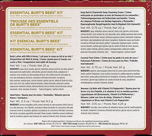 What's essential this time of year? Friends, family and spending time together. Show your friends and family how important they are to you with our Essential Burt's Bees Kit, a perfect sampler of ways to love their skin more naturally this year. • Benefits: -Cleanses and nourishes skin with an array of wholesome, natural products. • Includes: -Naturally Nourishing Milk & Honey Body Lotion (1 oz.) -Hand Salve (.3 oz.) -Soap Bark & Chamomile Deep Cleansing Cream (.75 oz.) -Coconut Foot Cream (.75 oz.) -Beeswax Lip Balm (.15 oz.)Feature