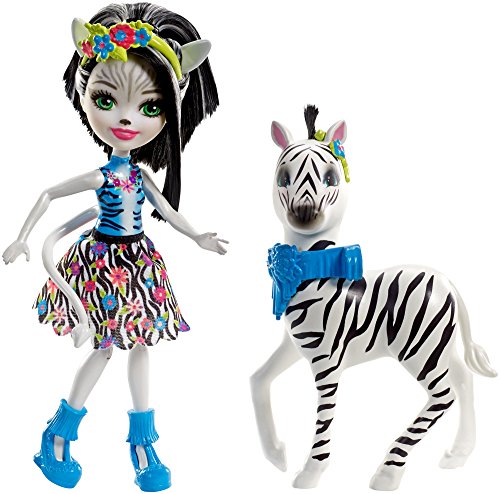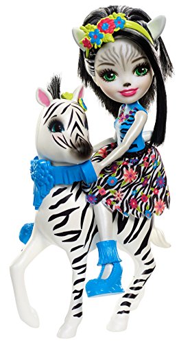 -. Feature : Zelena Zebra doll and her large zebra friend, Hoofette figure, are inspired by the world of Enchantimals / The 6" doll can ride the large figure for active storytelling and imaginative fun / Zelena Zebra doll wears a whimsical outfit with blue zebra-striped top, a colorful floral zebra print on her removable skirt and aqua shoes / A colorful floral hairpiece is so pretty in her black and white hair / Hoofette zebra friend has adorable details, like furry mane detail and cute expression, along with green reins and a removable headpiece that matches her bestie