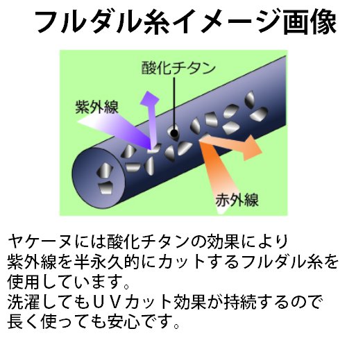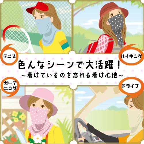 オシャレに日焼け防止ができる「ヤケーヌ」【特長】・オシャレに日焼け防止ができる「ヤケーヌ」。・着脱や水分補給も簡単なので便利。・UVカット率96%で、洗濯しても効果が持続する高機能素材を使用しています。・汗をかいてもすばやく吸収して乾く、吸汗速乾素材を使用。・開口部を設けた2部式の構造だから、息苦しくなく、飲み物もそのまま飲めます。・動きになじむ抜群のストレッチ性。運動や作業でもずれにくくしなやか。・吐いた息が下に抜けてメガネやサングラスがくもりにくい構造になっています。Feature