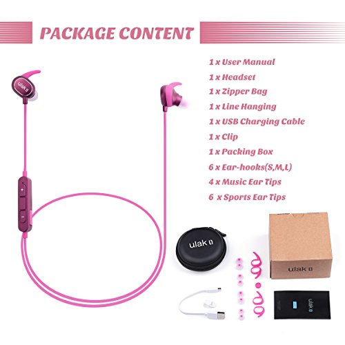 Studio : ULAK Publisher : ULAK Binding : Wireless Phone Accessory Product Description Applied with noise cancelling and EDR APT-X audio decode technology, this around - neck Bluetooth headsets are designed to make you hear music like you never had before! Songs voices come out crystal clear. The Bluetooth earphones have a good amount of bass to them and since they are passive noise canceling so you don't hear much of what's going around you. So watch out when you are crossing the road! Nothing is more annoying than an earbud that doesn't sit comfortably in your ear. Considering this, we put 5 different silicone ear tips S/M/L soft rubber ear hooks to get your best comfort.They won't fall out from your ears no matter how active you are! Additionally, we add a T-shirt clip in the package and you won't be bothered to worry you will lose the earphones somewhere. The Bluetooth earphones are quite easy to use and the bottons are easy to press. We'll also include a very detailed manual for your reference.The singal is strong enough: up to 30ft Bluetooth range in the open space and 10ft in the obstacles space. Features of ULAK Bluetooth headphones ? Premium sound with rich bass and crystal clear treble ? Delivers 7 Hours of Uptime ? Comfortable, secure fit with ergonomic design ? Sweatproof and premium made with soft smooth silicone gel surface ? In Ear, noise reduction with CVC 6.0 ? Latest 4.1 Bluetooth Technology ? Universal Compatibility with Smartphones, Tablets, Laptops etc... What's inside the package? ? ULAK-BT01 around - neck Bluetooth headphones ? 3 pairs of sports ear tips; 2 pairs of ear tips for music; S/M/L ear hooks ? USB charging cable ? Zippered carry case ? User manual ? T-shirt clip Worry-Free Warranty At ULAK, we believe in our products. That's why we back them all with an 12-month warranty and provide friendly, easy-to-reach support. 0