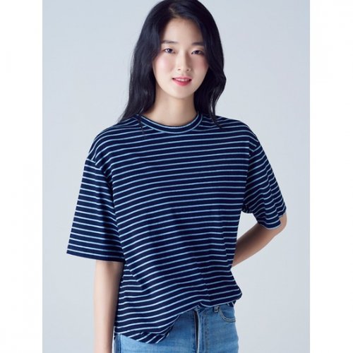 ● 차분한 컬러의 톤온톤 스트라이프 패턴이 올오버 되어진 티셔츠.