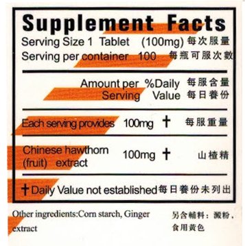 Studio : KGS Publisher : KGS Binding : Health and Beauty Product Description 山?降脂片 HAWTHORN EXTRACT (SHAN ZHA JIANG ZHI) Functions and indications: Reducing fat and freeing the vessels. Used for preventing atherosclerosis, keeping cardio-vein system circulation natural and cholesterin a normal level. Directions: Take 1-2 tablets 3 times a day. Packing: 100mg X 100 tablets per bottles. Caution: Do not use if pregnant. This statement has not been evaluated by the Food and Drug Administration. This product is not intended to diagnose, treat, cure, or prevent any disease. 0