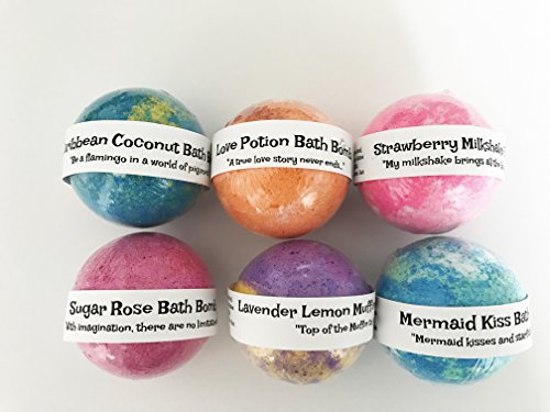 - HAND-CRAFTED WITH LOVE IN THE USA- alLof our ultra lush bath bombs are unique creations made by hand in the USA. This gift set contains these 6 amazing scents: Caribbean Coconut, Lavender Lemon Muffin, Love Potion, Mermaid Kiss, Strawberry Milkshake, Sugar Rose.
