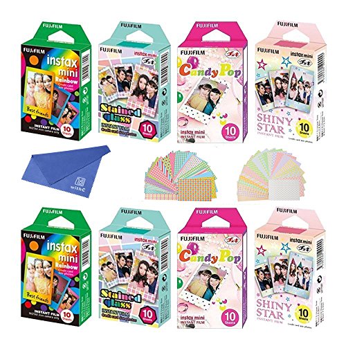 Fujifilm Instax Mini 8 Pack BUNDLE Rainbow, Stained Glass, Candy Pop, Shiny Star Single pack 10 sheets X 8 Pack = 80 Sheets + withC Microfiber Cleaning Cloth for Camera Lenses