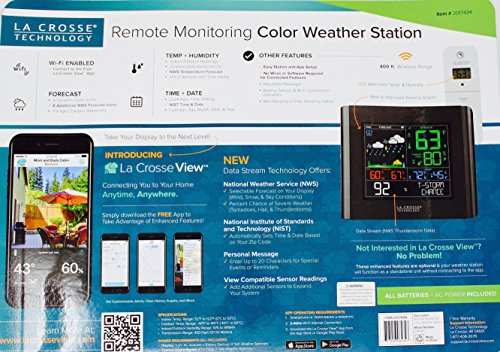 Studio : LA CROSSE Publisher : LA CROSSE Product Description *Easy to use and setup. *400 feet wireless range and Wi-Fi enabled. *Forecast, Temperature, Humidity, Time and Date. *Supports La Crosse View App. *All batteries and AC power adapter included. 0