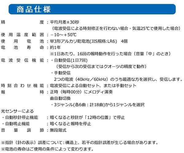 | 付属品 | 単3アルカリ乾電池×4、木ねじ(木の厚い壁・木の柱専用)×1、取扱説明書、保証書(保証期間:1年間) |