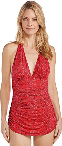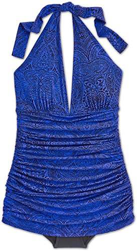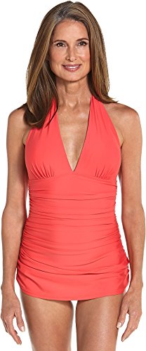 Figure-flattering sun protection at its finest! The Ruche Halter Swimsuit gives you coverage in all the right places with a ruched body and sides that visually slim and conceal. This one-piece features an elegant deep v-neck front with halter tie styling for secured support. Ruche skirt adds to the feminine silhouette and provides full back coverage.Feature