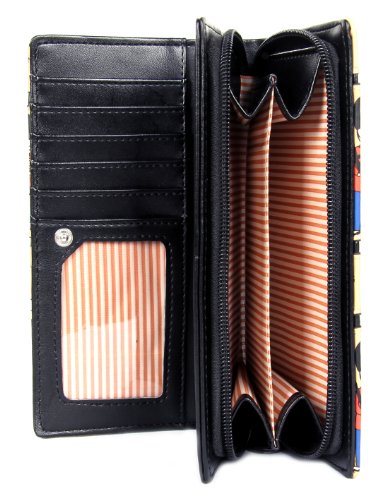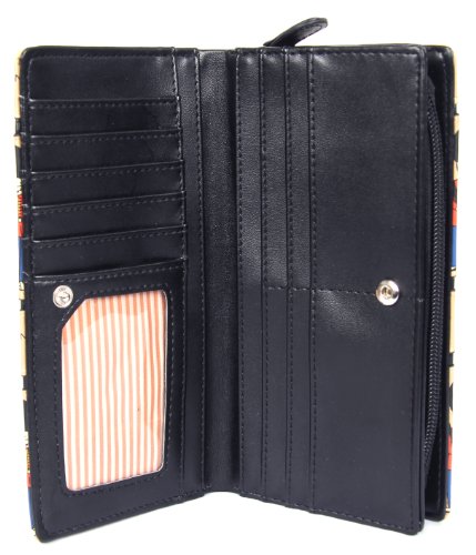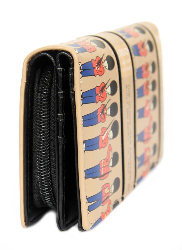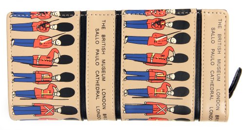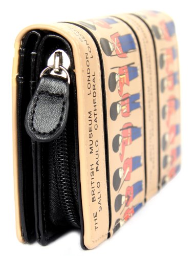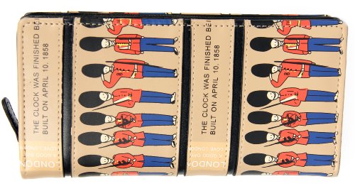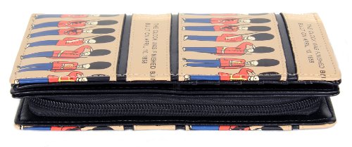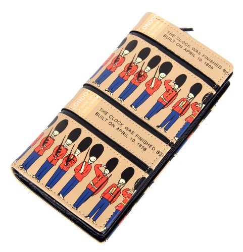 Product Description This stylish wallet is fully zippered with a spacious interior large enough for bills, cards, coins, small items, and a cell phone. This wallet can be used as a clutch purse. It features two rows of British Royal Guards in uniform. There is text between them. The wallet is made of soft PU material and is lined with polyester inside. 0